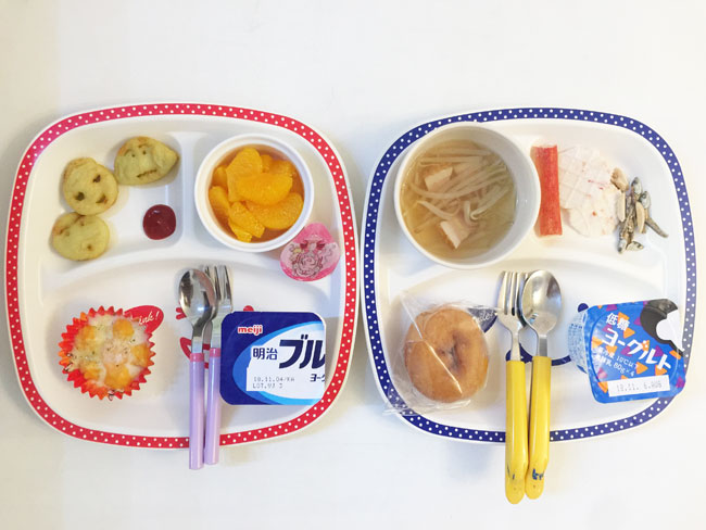 息子がドーナツにヨーグルト、カニカマに金目鯛煎餅と小魚アーモンドにベーコンともやしのスープ。